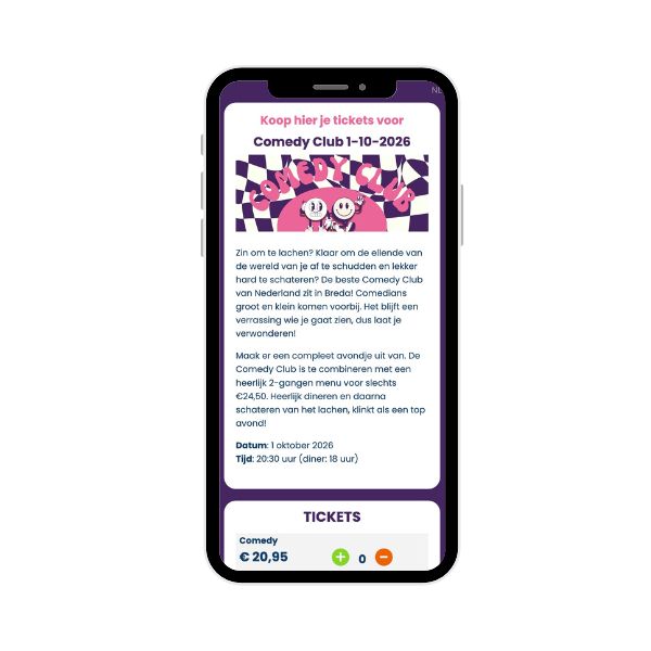 Voor comedy nights biedt Flextickets een soepel ticketsysteem dat betalingen direct op je eigen rekening uitkeert. Bezoekers kunnen eenvoudig tickets kopen en downloaden. Met de gratis scan-app controleer je gasten snel bij binnenkomst. Met persoonlijke ondersteuning en flexibele instellingen zorgen we dat je ticketverkoop moeiteloos verloopt en volledig naar wens is.